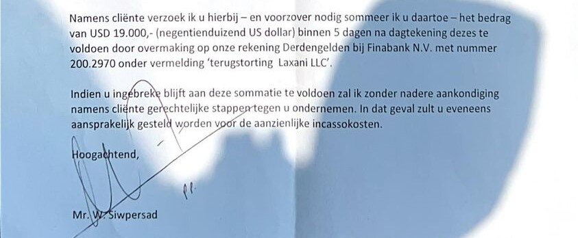 Op 10 augustus kreeg Roopram een schrijven van advocatenkantoor Naardendorp, waarin geëist wordt dat een bedrag van USD 19.000 binnen vijf dagen teruggestort wordt op de rekening van de bank. Als hieraan geen gehoor werd gegeven, zouden er gerechtelijke stappen volgen. Hij zegt niet aan deze eis te kunnen voldoen, omdat het bedrag niet dubbel is overgemaakt naar zijn bankrekening. Volgens de zakenman heeft de bank al zijn rekeningen op 30 augustus geblokkeerd, waardoor hij geen zaken meer kan doen.