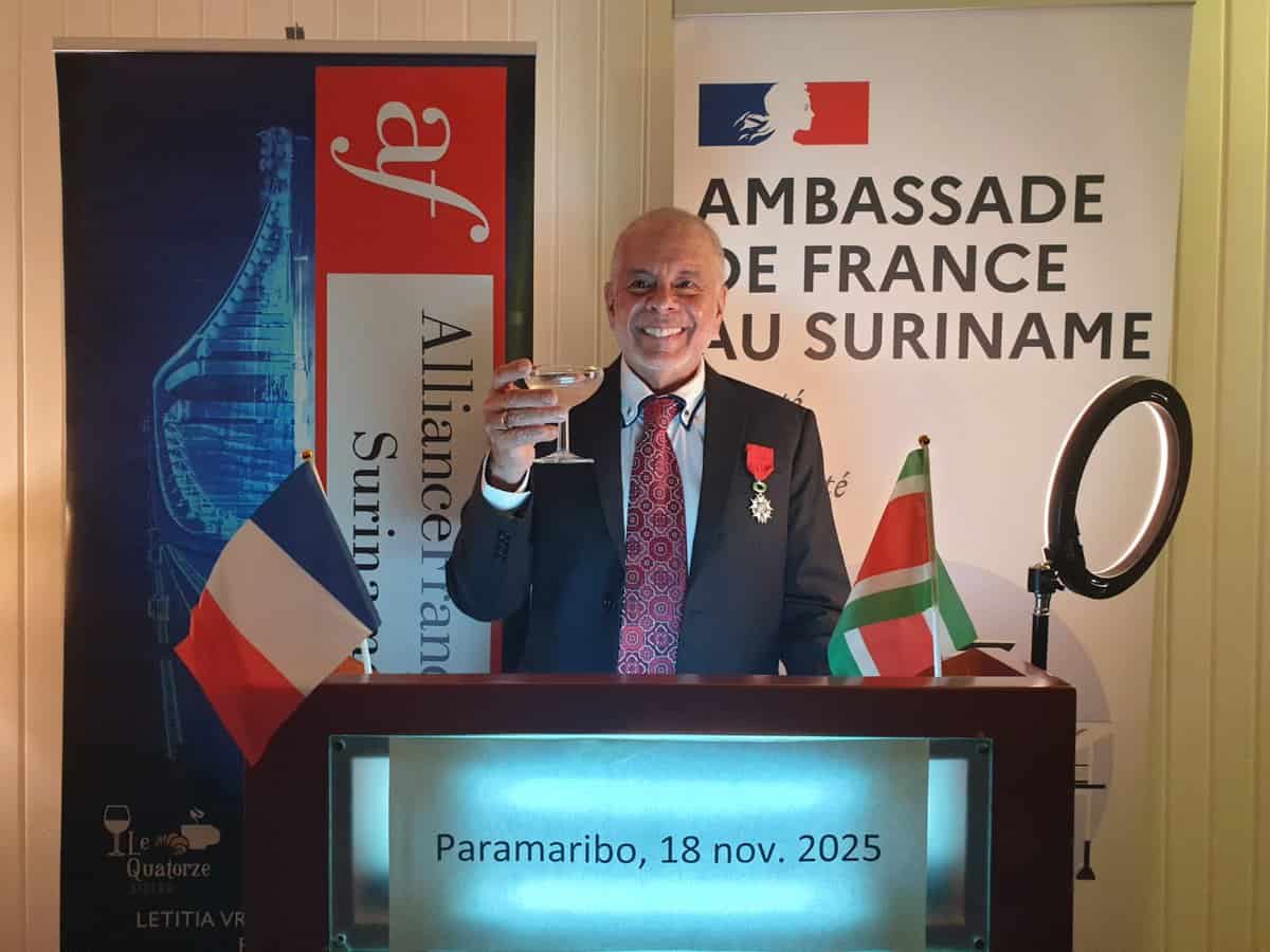 Met deze woorden startte dr. Ruben del Prado op dinsdagavond 18 november zijn acceptatiespeech, na ontvangst van een van de hoogste onderscheidingen van de Franse Republiek: Chevalier de la Légion d’Honneur, Ridder in het Legioen van Eer. In de residentie van ambassadeur Nicolas de Bouillane de Lacoste kreeg hij de medaille opgespeld door de Franse diplomaat, op voordracht van de Franse president Emmanuel Macron. “Voor zijn inzet voor de geneeskunde, de strijd tegen aids, de hiv-pandemie, de volksgezondheid op alle continenten en voor het opnieuw opstarten van de Alliance Française in Suriname”, lichtte De Lacoste toe, na een opsomming van Del Prado’s staat van dienst.