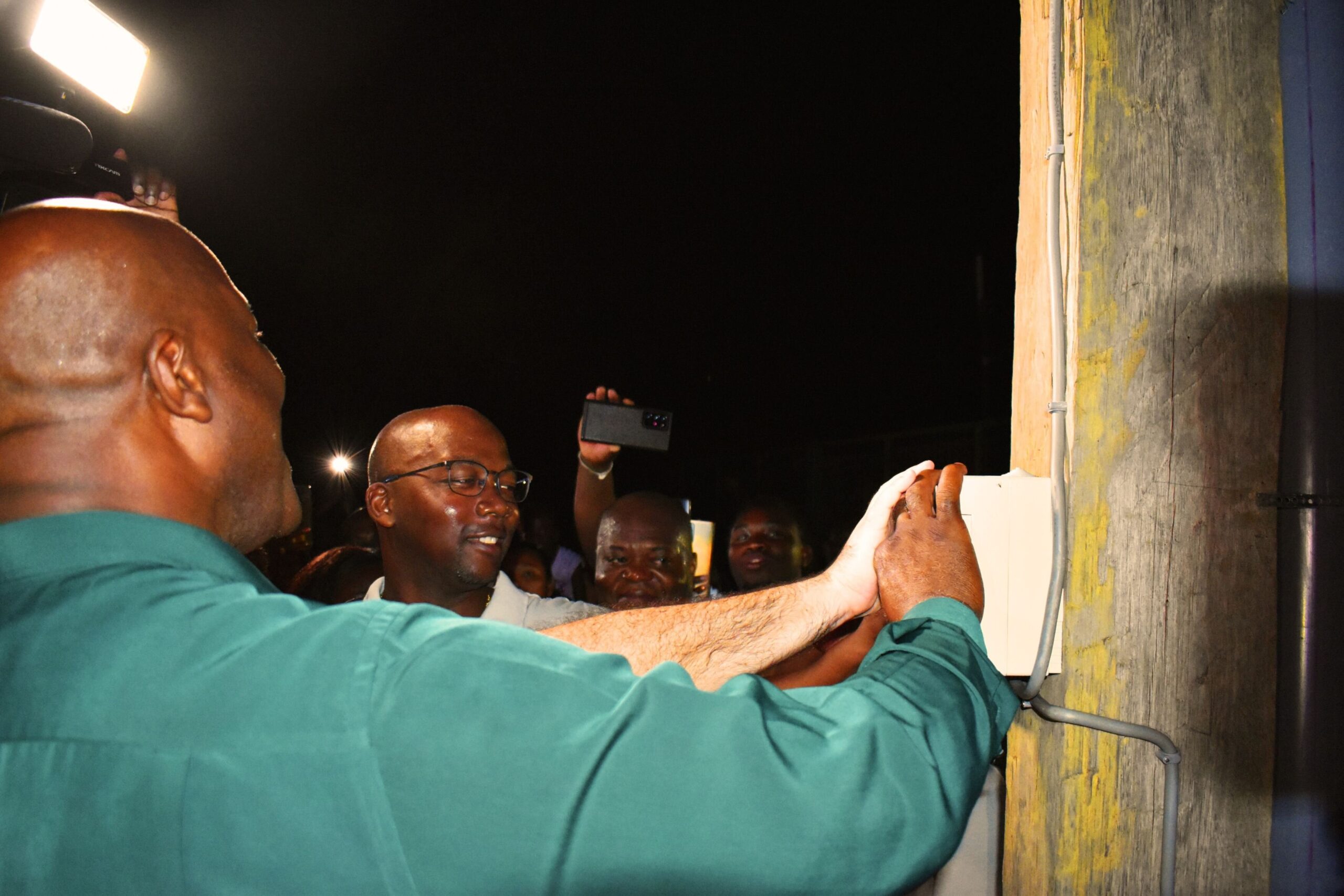 Vice-President Ronnie Brunswijk haalde samen met minister David Abiamofo van het ministerie van Natuurlijke Hulpbronnen (NH) en Inter-American Development Bank (IADB) vertegenwoordiger, Sergio Ballon, de schakelaar omhoog, waarna het dorp volledig werd verlicht. Met een vuurwerkspektakel werd de sfeer rond de ingebruikname van het solarsysteem opgevoerd, waarna het publiek zich al juichend naar de krutu oso baande voor de samenkomst.