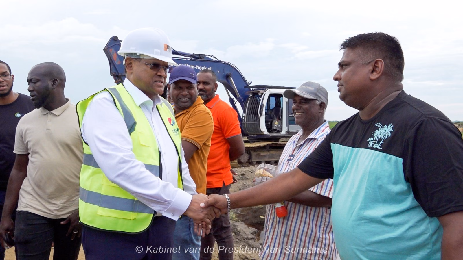 Santokhi benadrukte bij de ingang van de Karachiweg in de Westelijke polders het belang van de rehabilitatie van zes waterschappen, terwijl de andere zes waterschappen een grondige onderhoudsbeurt krijgen. Dit is essentieel voor het verhogen van de rijstproductie.