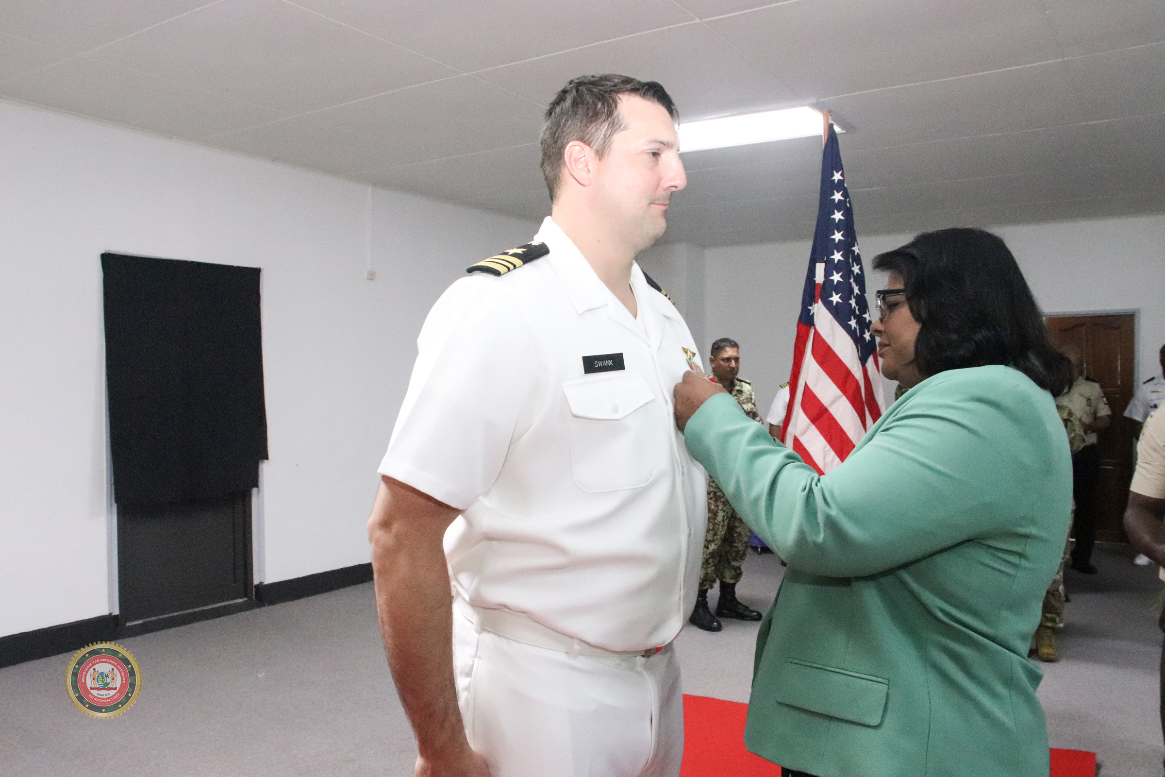 De diensttijd in Suriname van luitenant-commandant Nathaniel Swank, Military Liaison Officer (MLO) van de Verenigde Staten van Amerika, zit erop. Op woensdag 24 april 2024 is hij door minister Krishnakoemarie Mathoera van Defensie gedecoreerd met de medaille voor speciale verdiensten in de rang van commandeur.