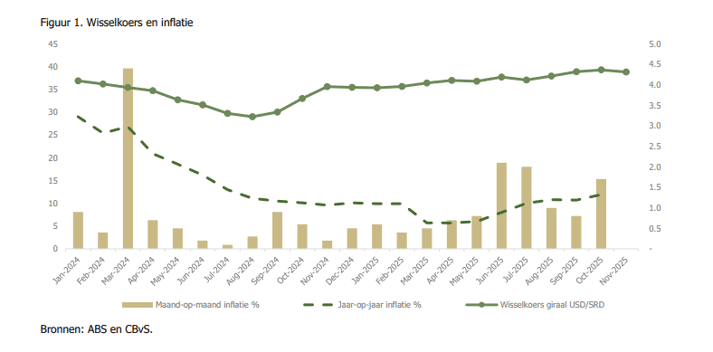 De Suriname Economic Oversight Board (SEOB) meldt in haar 26e bulletin (december 2025) dat de jaar-op-jaar inflatie in 2025 verder is opgelopen en in oktober uitkwam op 11,9%. In dezelfde maand verloor de Surinaamse dollar (SRD) licht aan waarde tegenover de Amerikaanse dollar (0,5%) en de euro (0,4%). SEOB wijst erop dat wisselkoersdruk direct doorwerkt in importkosten en consumentenprijzen, waardoor de inflatoire druk kan aanhouden.