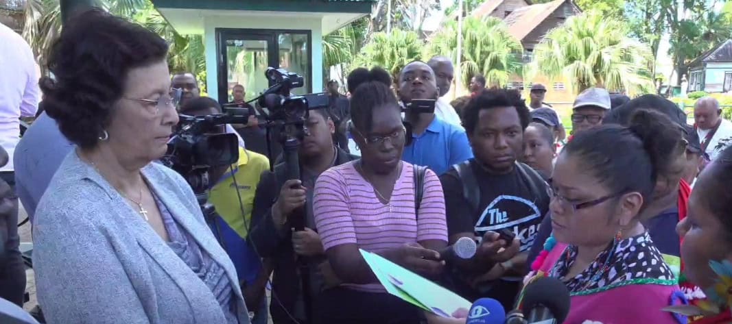 De groep werd na meer dan een half uur wachten ontvangen door het staatshoofd en zij kreeg een petitie aangeboden. De resultaten van een miniconferentie van inheemse groepen is eerder opgestuurd naar de president. Het kabinet en het staatshoofd hadden tot vanmorgen nog geen reactie gegeven. President Simons geeft aan dat de uitnodigingen voor de inheemse conferentie haar niet hebben bereikt. Ze benadrukt dat zij de inheemse organisaties bedankt voor het vertrouwen in de nieuwe regering en dat die de problemen wel bereid zijn op te lossen.