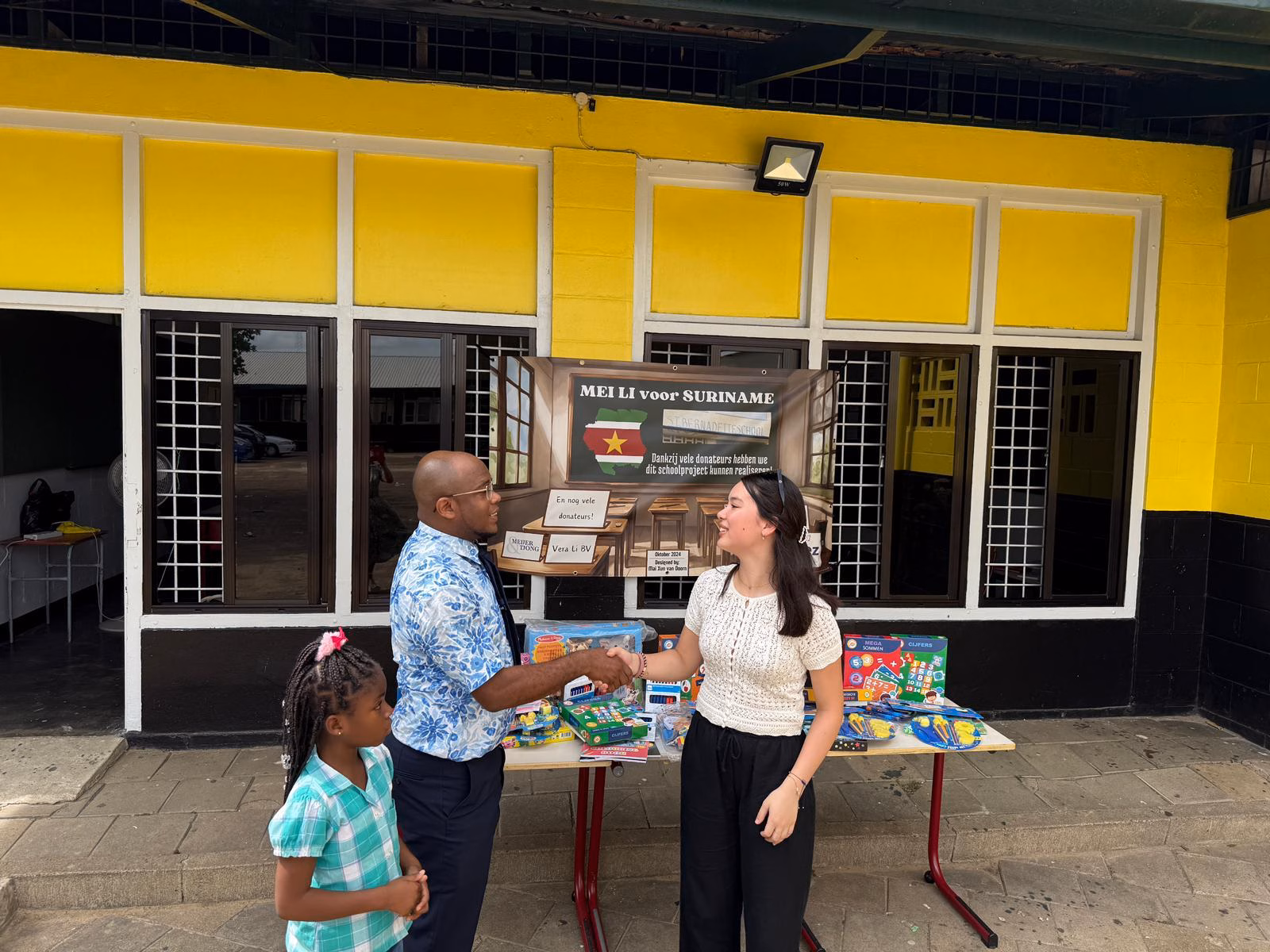Mei Li van Doorn heeft 30 tafels en stoelen voor de school aangeschaft in Nederland en via zeevracht overgebracht naar Suriname. De school, die 492 leerlingen telt, krijgt ook ondersteuning van Van Doorn om de mediatheek verder in te richten.