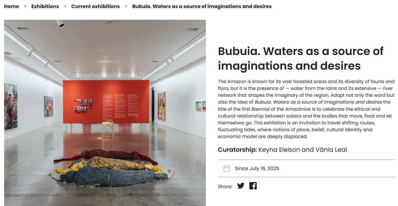 De titel van de tentoonstelling, Bubuia. Waters as a Source of Imaginations and Desires, verwijst naar het begrip dibubuísmo van de Braziliaanse dichter João de Jesus Paes Loureiro. Het idee van estar de bubuia – drijven op het water – symboliseert een balans tussen beweging en stilte, en weerspiegelt de levenswijze en veerkracht van gemeenschappen in het Amazonegebied. Volgens de curatoren Keyna Eleison en Vânia Leal is Bubuia niet enkel een cultureel concept, maar een manier van bestaan die de relatie tussen mens en natuur belichaamt.