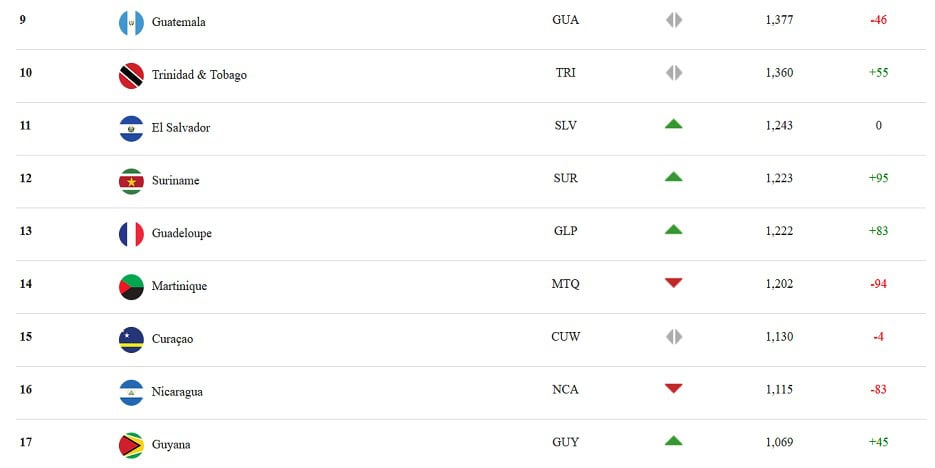Martinique (1.202) op de 14e plaats en Nicaragua (1.115) op de 16e plaats zijn de partijen die het meest zijn gedaald, elk drie plaatsen lager op de ranglijst. De Verenigde Staten waren de volgende en zakten twee plaatsen naar de vierde plaats.