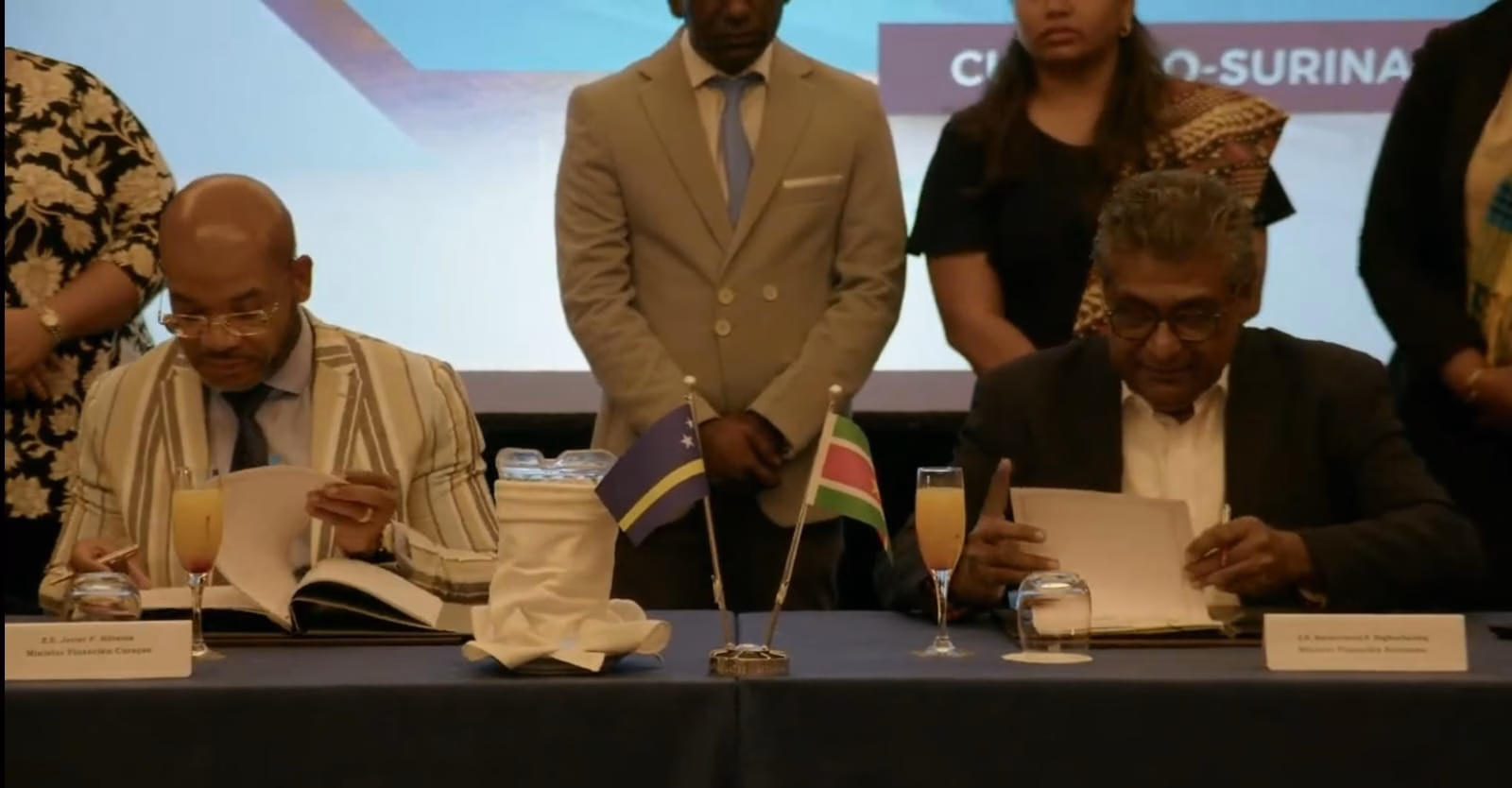 “In een plechtige ceremonie” gehouden in het Marriott Hotel op Curaçao, hebben Suriname en Curaçao een mijlpaal bereikt met de ondertekening van een nieuw belastingverdrag. Dit verdrag, dat tot doel heeft dubbele belastingheffing te voorkomen en aanzienlijke fiscaal-economische belemmeringen weg te nemen, werd ondertekend door de ministers van Financiën van Curaçao en Suriname, Javier Silvania en Stanley Raghoebarsing.