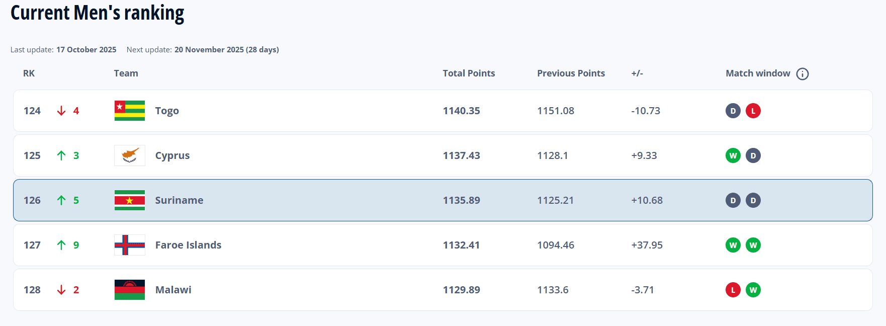 Suriname heeft een flinke sprong gemaakt op de FIFA-ranking, die recent is gepubliceerd door de mondiale voetbalbond. Natio maakt vijf stappen vooruit en klimt van de 131ste naar de 126ste plek.