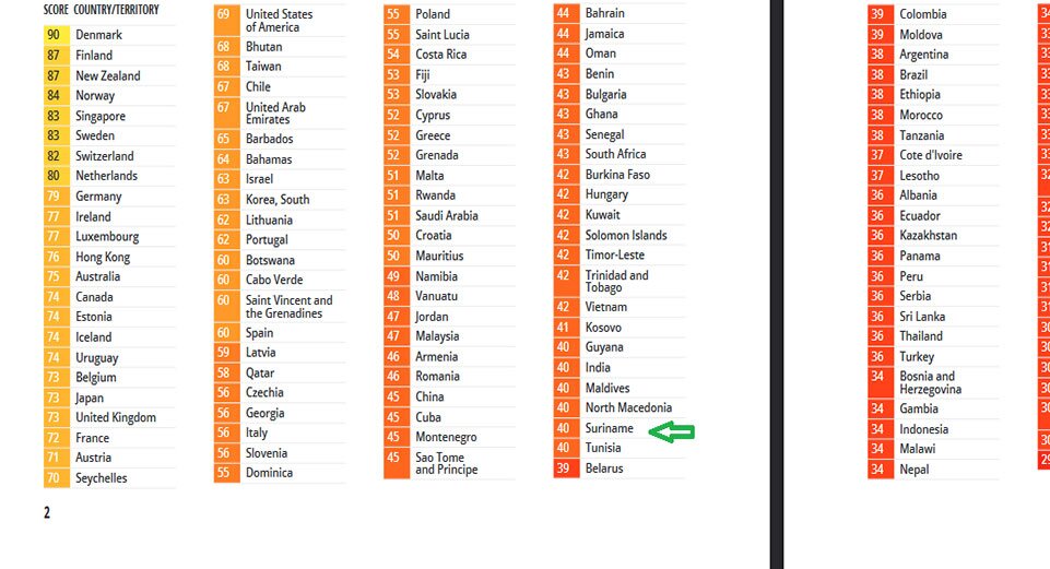 Suriname heeft slecht gescoord op het corruptierapport van Transparency International, dat dinsdag werd gepubliceerd. Suriname scoorde 40 op het rapport.