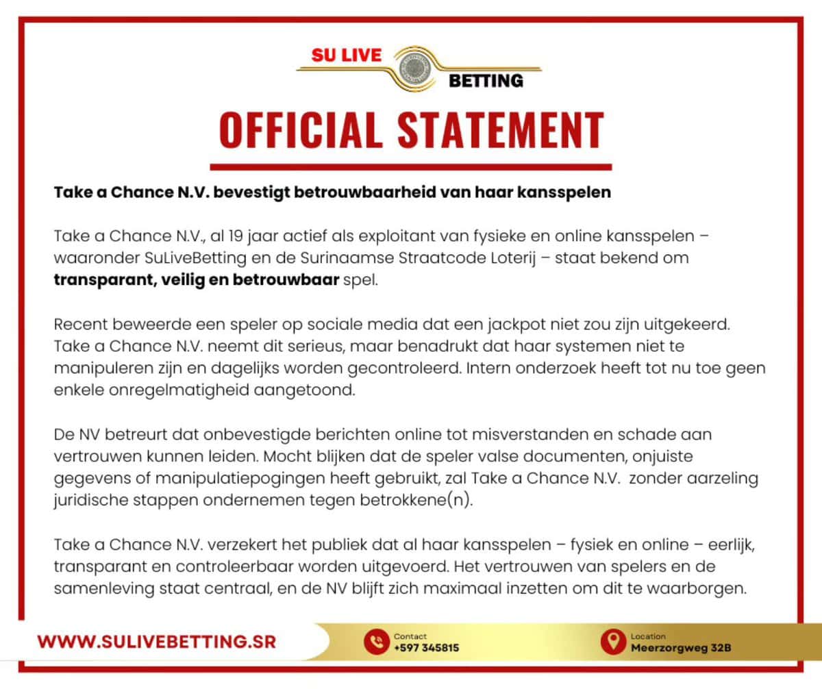 In de officiële verklaring noemt Take a Chance N.V. zich al 19 jaar exploitant van fysieke en online kansspelen, waaronder SuLiveBetting en de Surinaamse Straatcode Loterij. Het bedrijf stelt dat het “transparant, veilig en betrouwbaar” opereert en zegt de uitlatingen van de speler op sociale media serieus te nemen. Tegelijk benadrukt het bedrijf dat de gebruikte systemen niet te manipuleren zijn en dat er dagelijks controles plaatsvinden.
