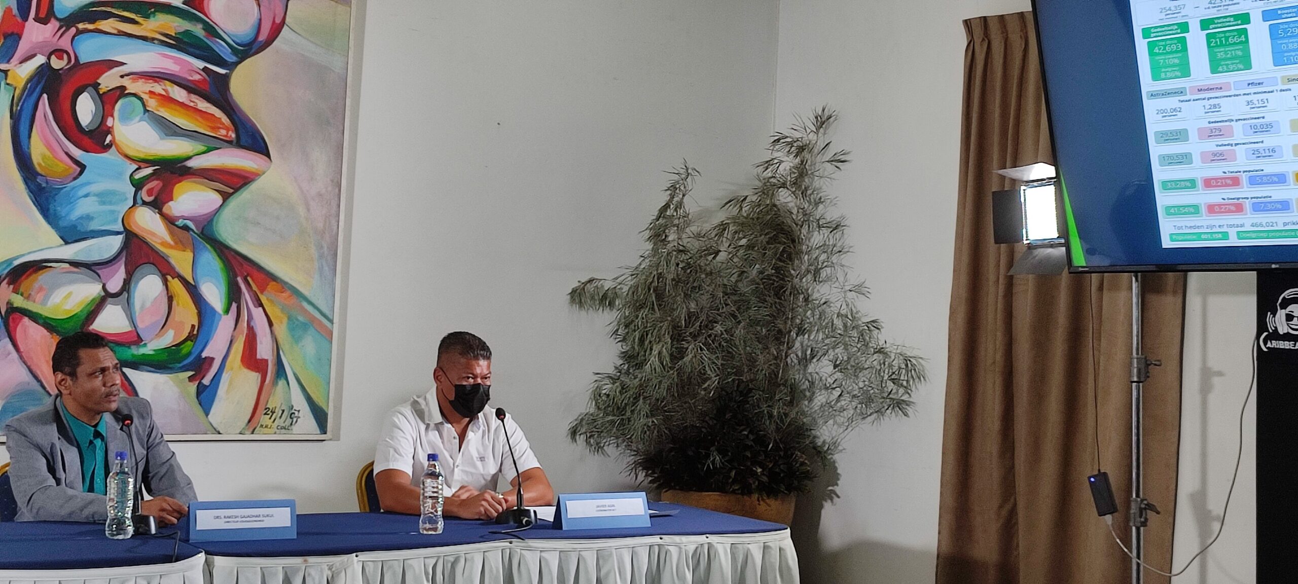 “Als je deze vierde golf vergelijkt met de derde dan zien we dat het niet evenredig meegaat met de derde golf, dankzij de vaccinatiegraad die wij nu hebben in de vierde golf”, legt de directeur van Volksgezondheid, Rakesh Gajadar Sukul, uit tijdens de reguliere Covid-19-persconferentie donderdag.
