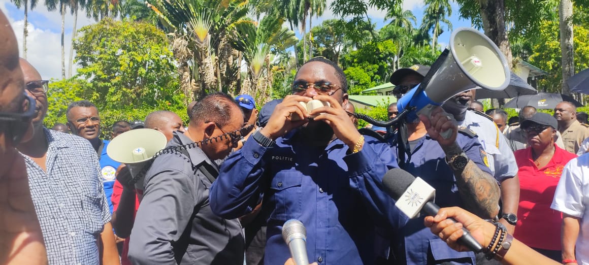 Een massa mensen verzamelde zich vanmorgen aan de Heiligenweg. Na het zingen van het volkslied liep de menigte naar het Kabinet van de President om de motie in te dienen. Regeringsleider Chan Santokhi is echter in de vroege ochtend naar Barbados vertrokken en is op doorreis naar Saoedi-Arabië voor een Caricom-top met het olieland.