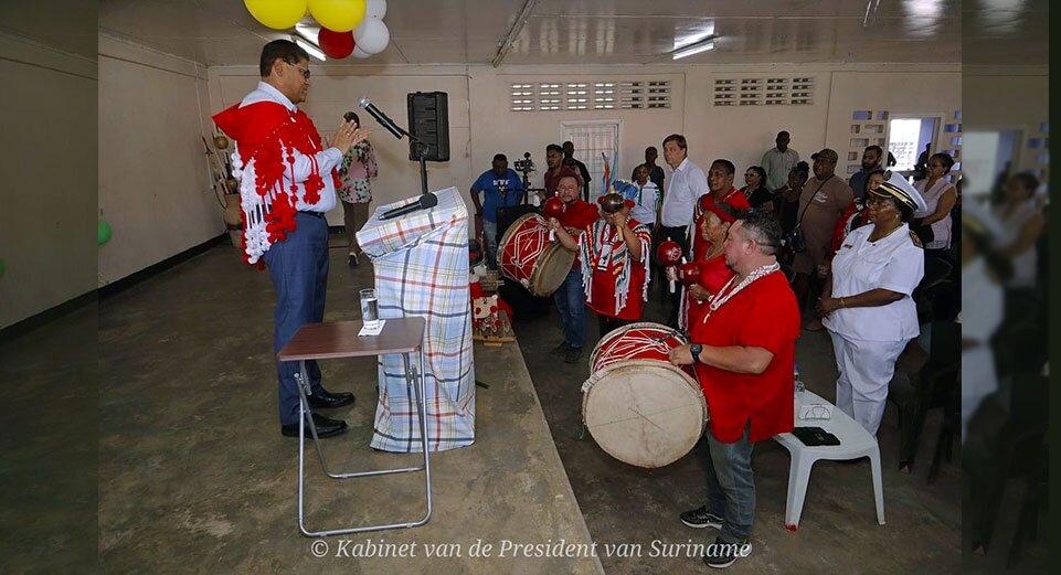Onder begeleiding van gezellige samboera muziek, werd de president binnengehaald bij de viering van Wereld Toerisme Dag, te Bernharddorp in het district Para.
