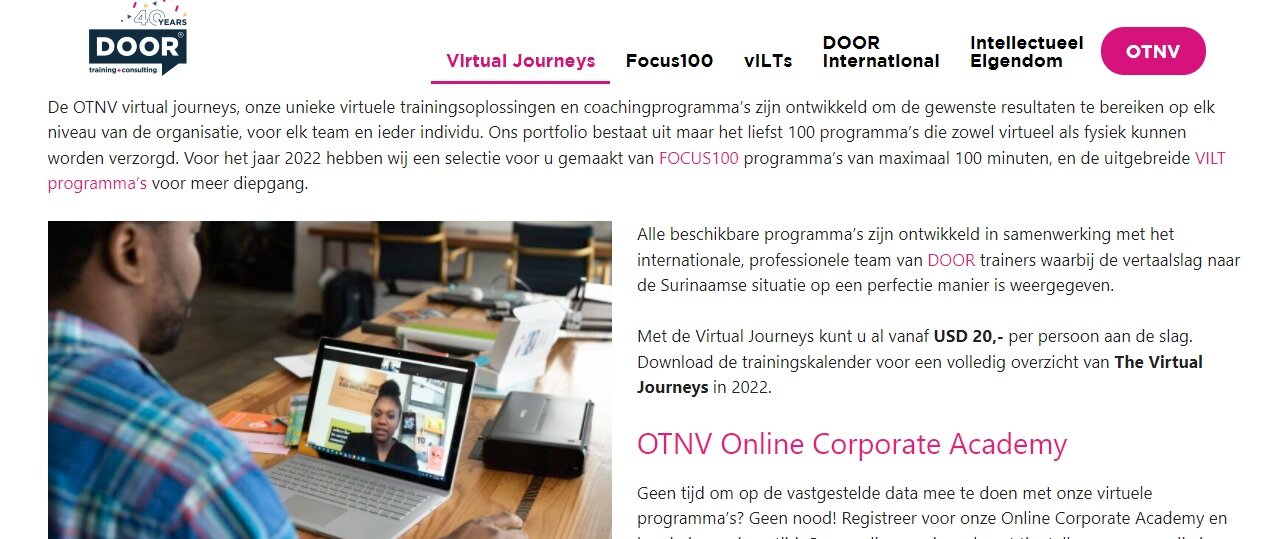 De online trainingen zijn vooral open trainingen, deze zijn volgens Li A Young over het algemeen heel praktisch, interactief en bruikbaar. Op de Virtual Journeys website staat een overzicht van alle virtuele trainingen die OTNV aanbiedt in 2022 in samenwerking met haar internationale partner DOOR International. Er zijn voor het jaar liefst 15 virtuele trainingen ingepland die via de website worden aangeboden.