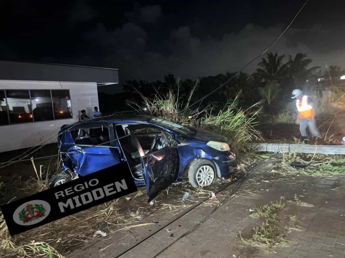 Een Toyota Vitz is maandagavond 2 maart 2026 tegen een EBS-mast gebotst na een aanrijding met een Isuzu D-Max op de Kwattaweg, ter hoogte van de Jadnanansinglaan in Wanica. De politie van bureau Kwatta kreeg in de avonduren melding van het ongeval en stelde ter plaatse een voorlopig onderzoek in.