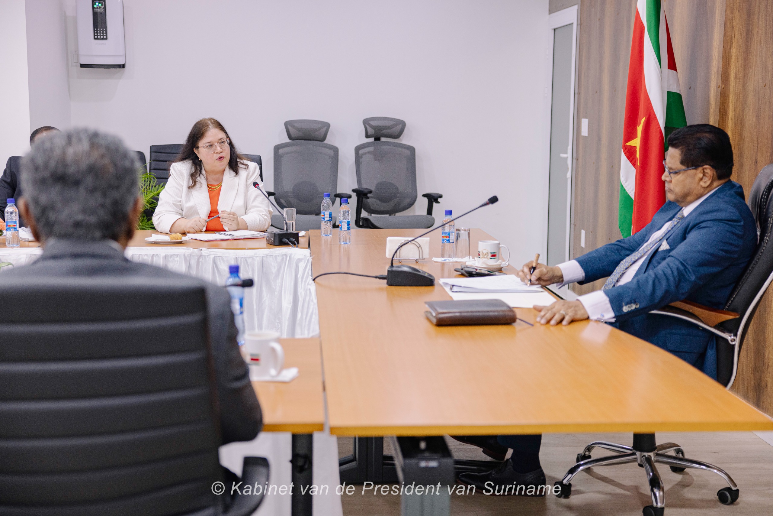 President Chandrikapersad Santokhi en een delegatie van het Internationaal Monetair Fonds (IMF), onder leiding van Anastasia Guscina, hielden een belangrijke bijeenkomst.