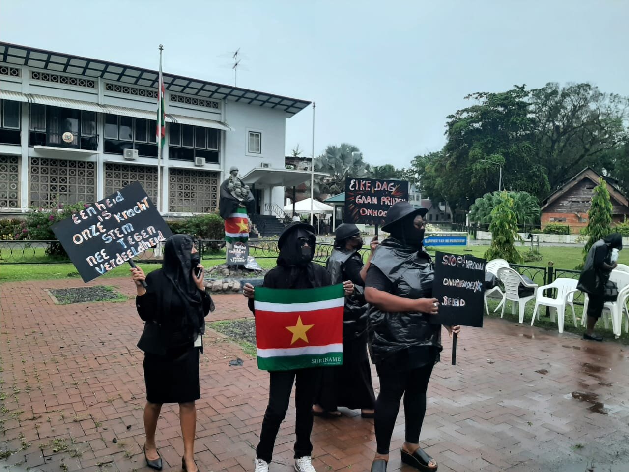 Wij staan hier om de wereld te laten weten dat wij op Internationale Vrouwendag in de rouw zijn. Dit zegt Ann Sadi, assembleelid van de Nationale Democratische Partij (NDP). Zij heeft samen met partijgenoten geprotesteerd op de Internationale Dag van de Vrouw bij het standbeeld van Mama Sranan, voor het Kabinet van de President.