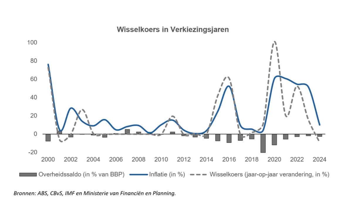 Na jaren van stijgende inflatie – met een piek van 61% in 2020 – lijkt er in 2024 enig herstel zichtbaar, met een daling tot circa 10%. Toch blijven bedrijven en burgers kwetsbaar. Vooral in verkiezingsjaren, zoals eerder bleek in 2000, 2011, 2016 en 2020, neemt de koersdruk toe. Dit valt vaak samen met extra overheidsuitgaven zoals loonsverhogingen of sociale toelagen, zonder economische onderbouwing.