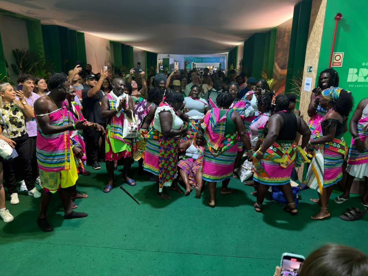 De aanwezigheid van de VSG op COP30 kreeg een bijzondere culturele lading door een optreden van de Seketie-groep in de groene zone van de conferentie. Met zang, traditionele ritmes en dans, uitgevoerd door Saamaka-vrouwen en basia Paul Wooje van Guyaba, werd de diepe verbondenheid met het bos verbeeld. De kleurrijke pangi’s en liederen beschreven de schoonheid en waarde van het bos voor het menselijk bestaan en legden de link tussen mensenrechten, cultureel erfgoed en klimaatactie.