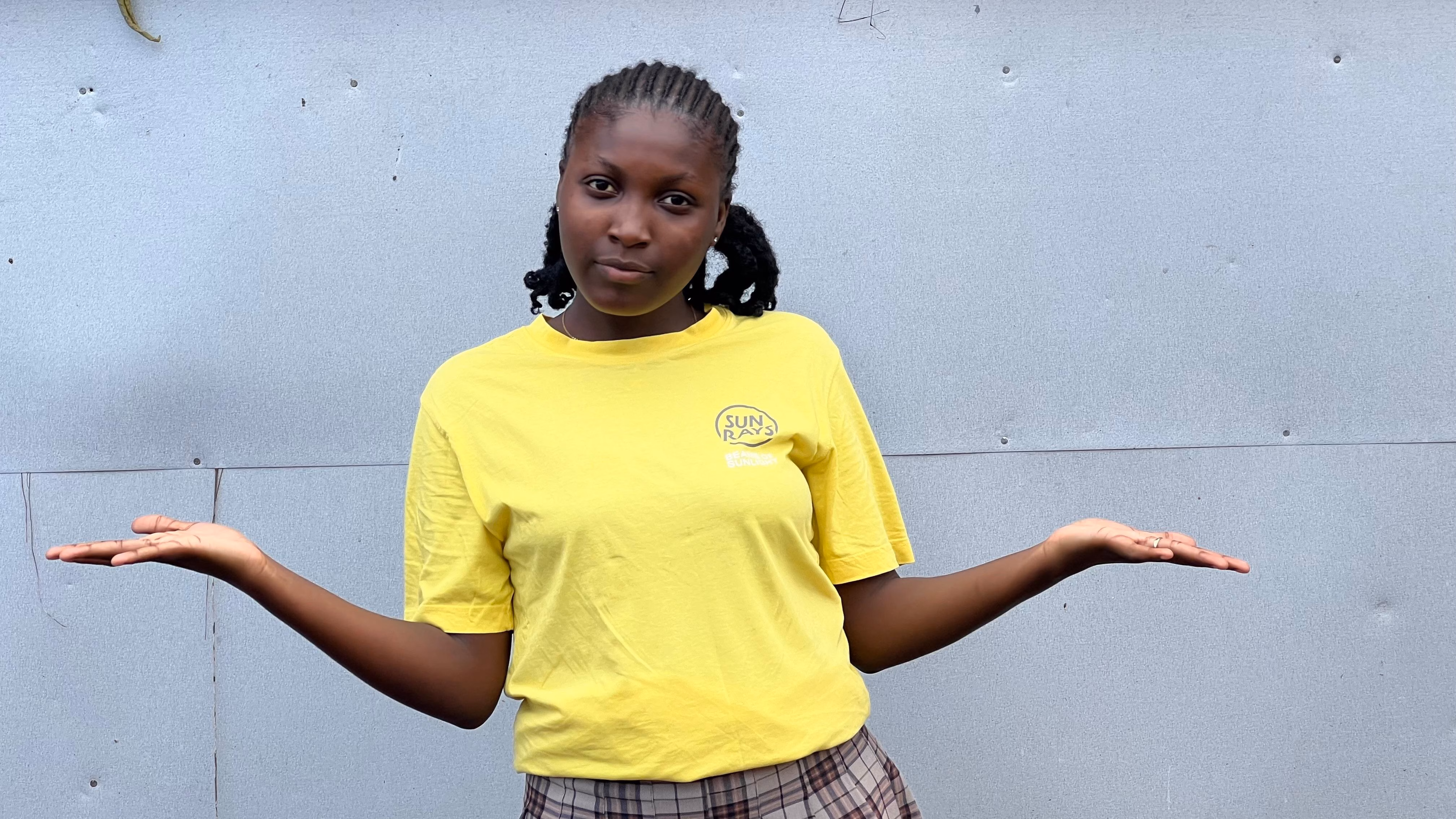 “Ik zit nog op school en na school doe ik huishoudelijk werk, daarna pak ik mijn schriften, ik kijk dan alles na wat de leerkrachten die dag hebben behandeld. Daarna ben ik vrij, dan kan ik meedoen aan die activiteiten. Doe je best op school, doe wat in de huishouding en sluit je aan in onze groep!”, moedigt ze haar leeftijdsgenoten aan. “Ze had nog nooit toneel gespeeld en was zelf verrast om haar talent te ontdekken”, zegt Maggie Schmeitz, directeur van Ultimate Purpose, die de voorstelling op touw heeft gezet.