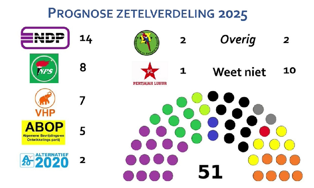 Volgens de peiling blijft de NDP de grootste partij met 14 zetels, gevolgd door de NPS met 8 zetels. De ABOP komt op 5 zetels uit, A20 en BEP behalen elk 2 zetels, de PL krijgt er 1, en de VHP komt uit op 7 zetels—een forse daling. Zowel de VHP als de ABOP verliezen terrein in vergelijking met eerdere peilingen.